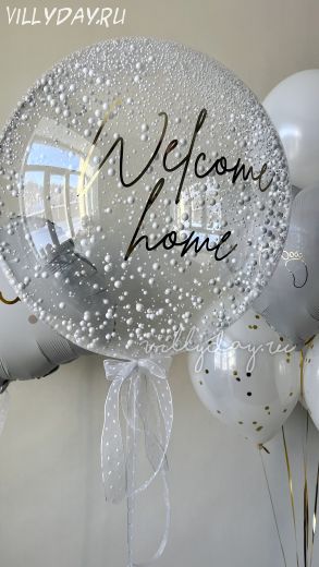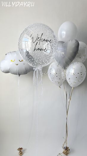 Состав: облачко, шар с пенопластом и надписью, фонтан из 3 белых шаров, сердца с рисунком, 3 шаров дабл с конфетти.