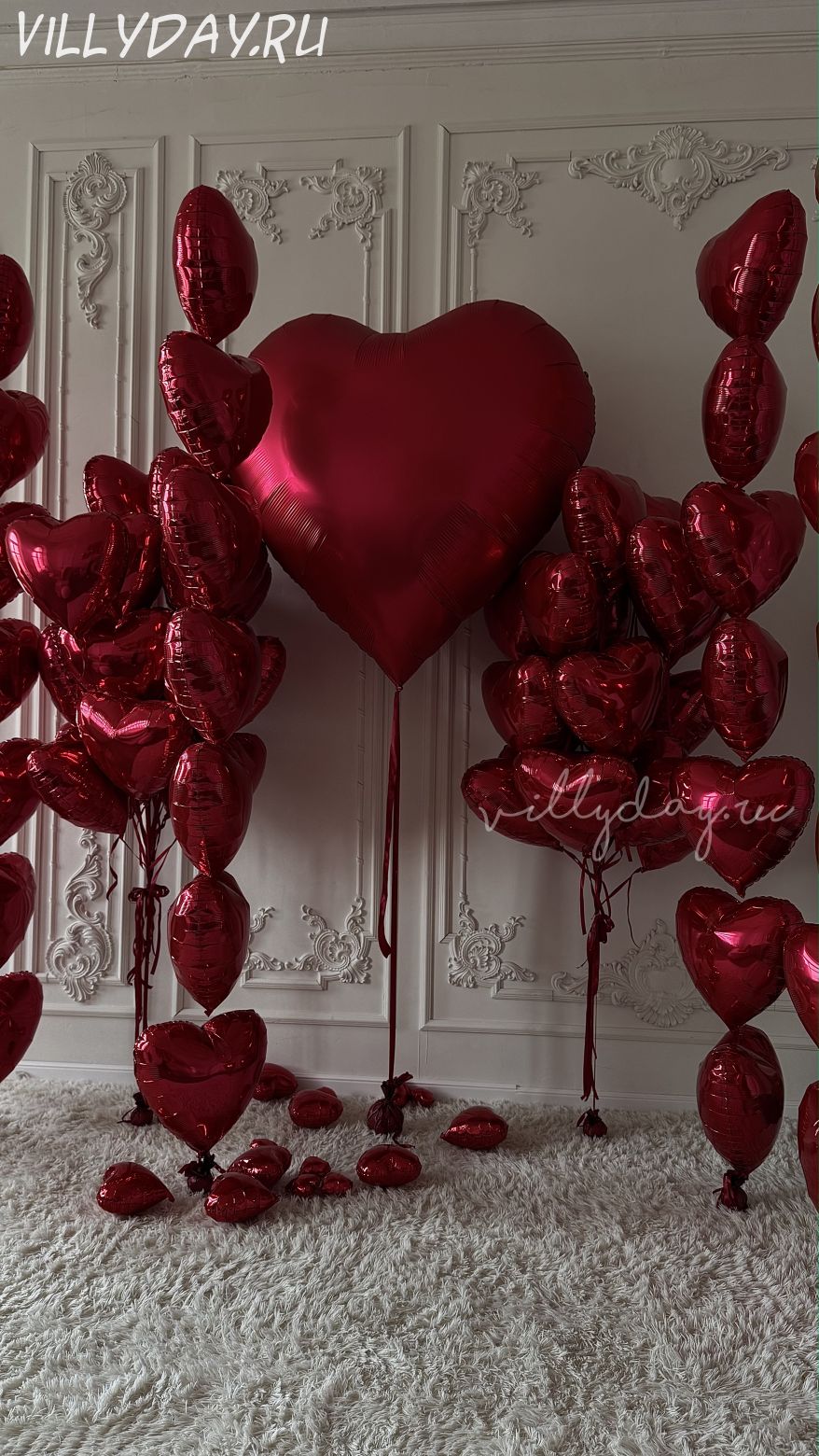 Сердце гигант, 2 фонтана по 15 сердец,4 цепочки по 7 сердец,10 сердец 9" на пол, 5 сердец 4" на пол.