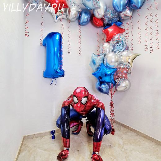 -Большой человек паук- -Цифра на грузике -Фонтан (5 звезд, 7 шаров хром, 3 шара с конфетти) -Шары под потолок (5 звезд, 10 шаров хром, 4 шара с конфетти)