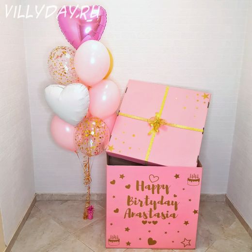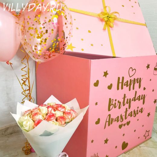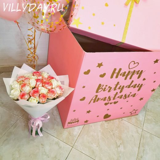 Состав: коробка с индивидуальной надписью, фонтан из 7 шаров (2 фольги, 2 шара с конфетти, 3 шара латексных), букет из 25 роз.