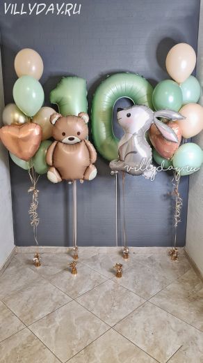Набор на день рождение в стиле лесные зверята. Состав: 2 цифры, заяц и медвежонок на грузике, 2 фонтана (6 шаров пастель, шар хром золото, сердце)