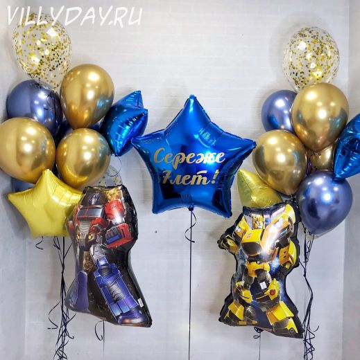 2 фонтана (2 звезды, 2 шара с конфетти, 6 шаров хром), цифра на грузике, звезда большая на грузике, 2 фигуры Трансформеры на грузиках