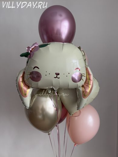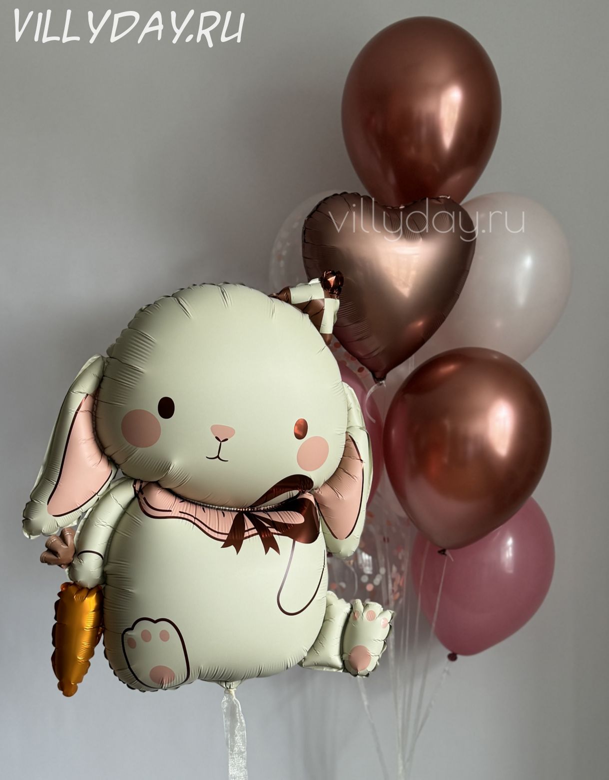 Зайка, фонтан (5 латексных шаров, 2 шара хром, 2 шара с конфетти, сердце)