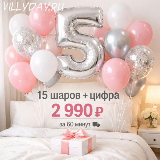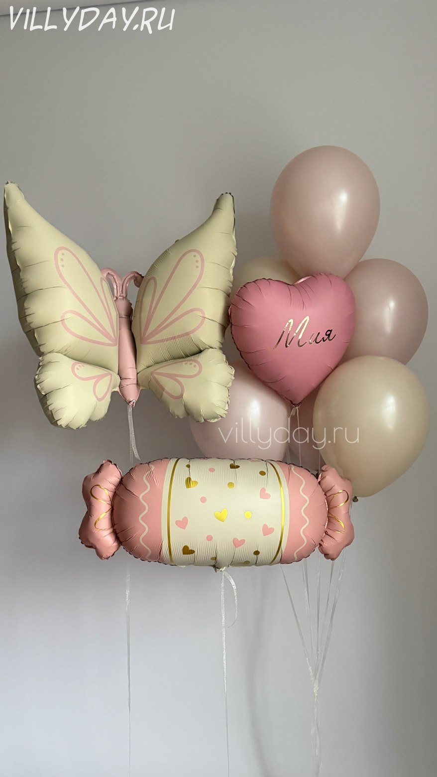 Бабочка, конфета, 6 латексных шаров, сердце с надписью.