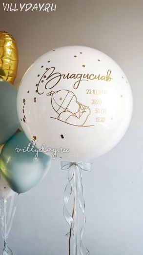 Даблшар с метрикой/надпись, дельфин,фонтан(3 сердца золото, 4 латексных шара)