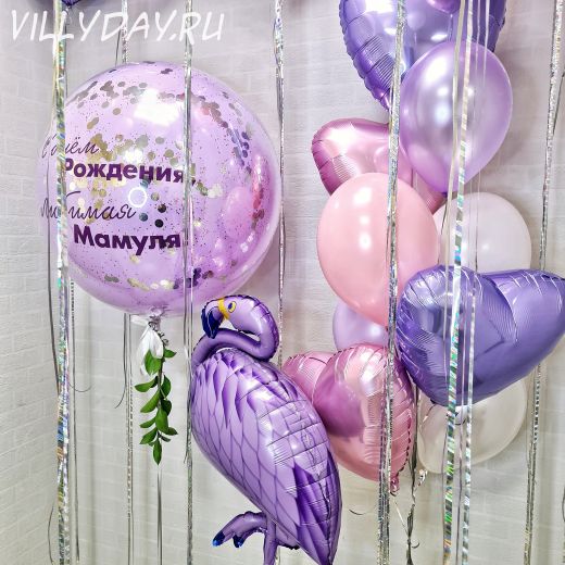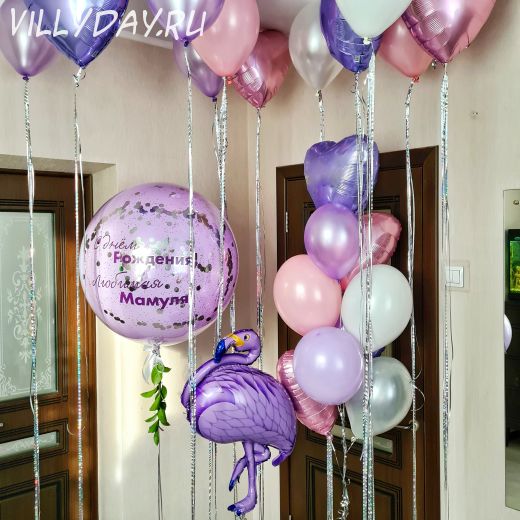 Состав: большой шар дабл стафф с индивидуальной надпись и зеленью, фламинго на грузике, фонтан (5 латексных шаров, 4 фольгированных сердца), под потолок: 7 латексных шаров,5 фольгированных сердец с декором дождик.