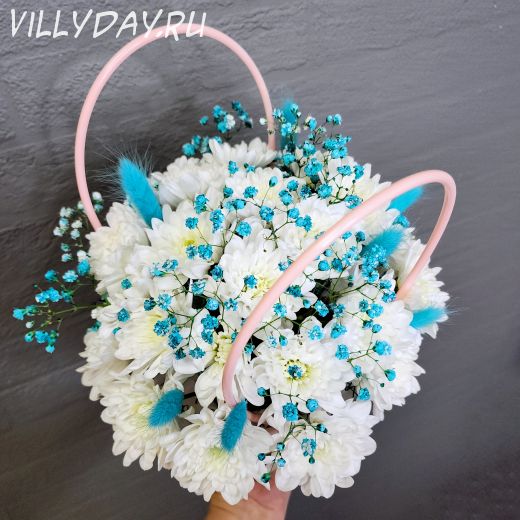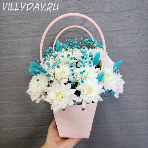 Сумочка с хризантемой и гипсофилой подойдет для любого повода, будь то день рождение или просто знак внимания. Милой особенностью станут веточки лагуруса (пушистые хвостики :-)).