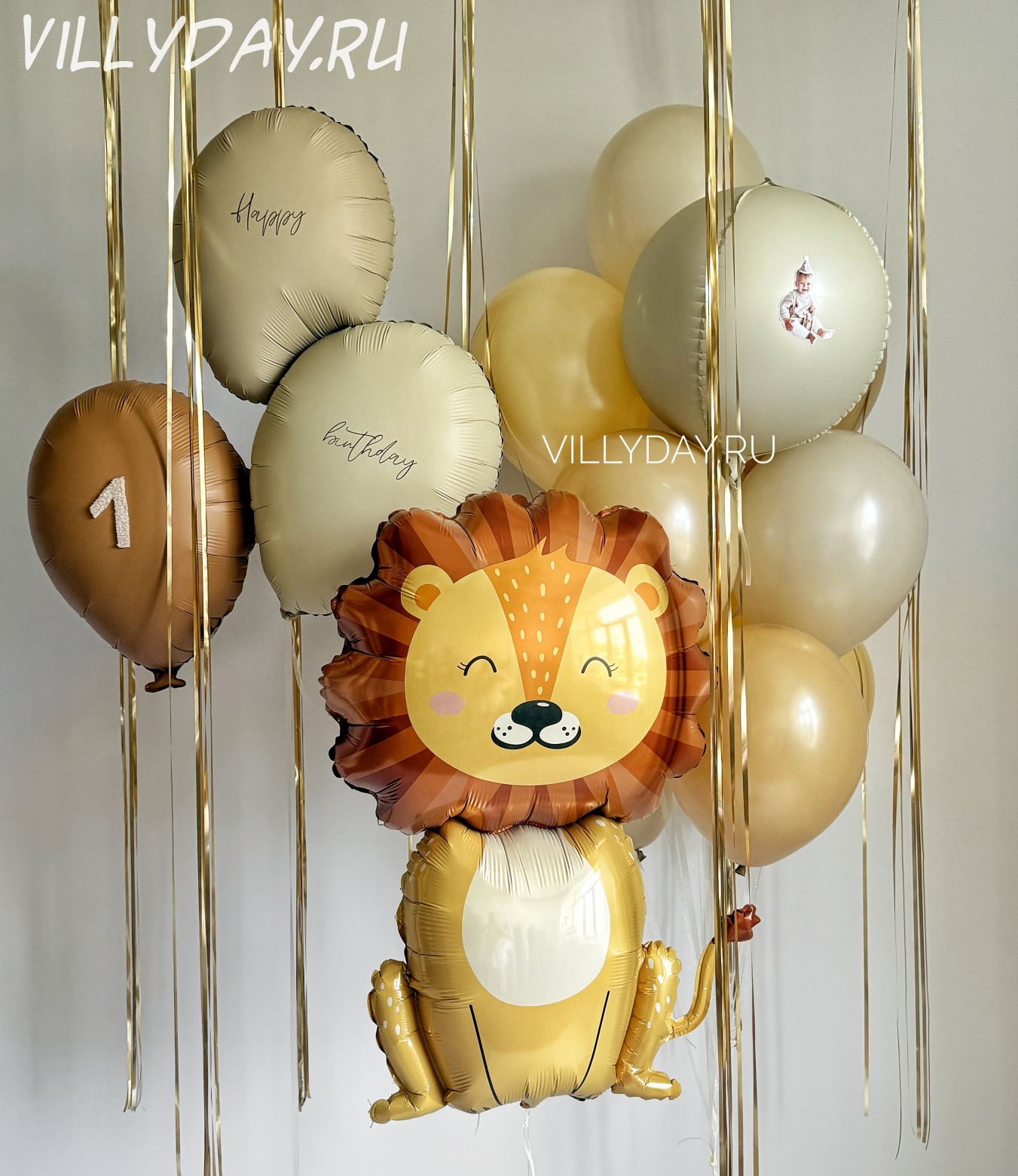 Лев, тройной шар с надписью, фонтан (сфера с фото, 9 шаров пастель ), 10 шаров под потолок с дождиком.